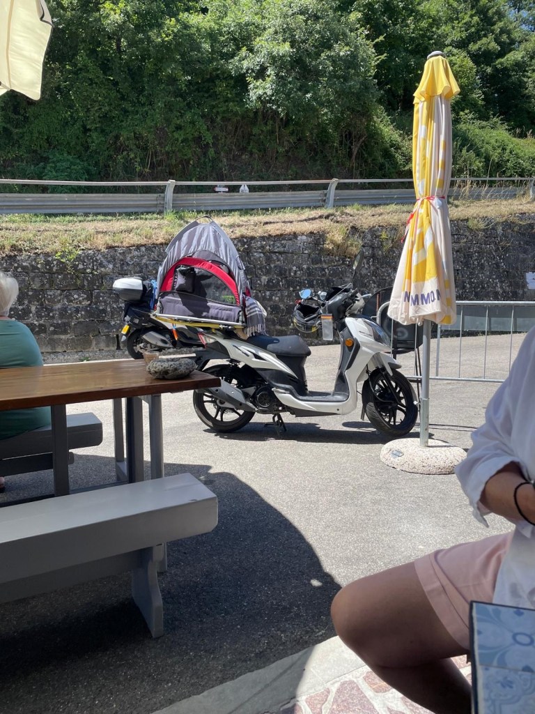 De scooters werden bevoorraad: flesjes water, eten voor Prins, zijn eigen voer en waterbak – ja hoor, hij heet niet voor niets Prins en haalt z’n neus op voor de geuren van soortgenoten! Voor onszelf een klein koffertje, een heuptas met portemonnee en telefoon, plus een losse tas met opladers en handige rommel – denk aan een schaar en tie-wraps. En toen… op pad!