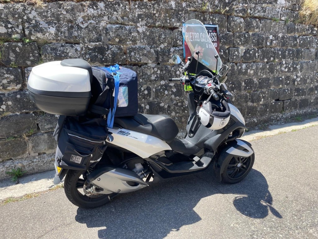 We huurden een scooter in Massa, maar thuis moest eerst onze vriend Prins z’n box op de scooter worden bevestigd. (Een fietskar waarvan we de wielen niet gebruiken.)
